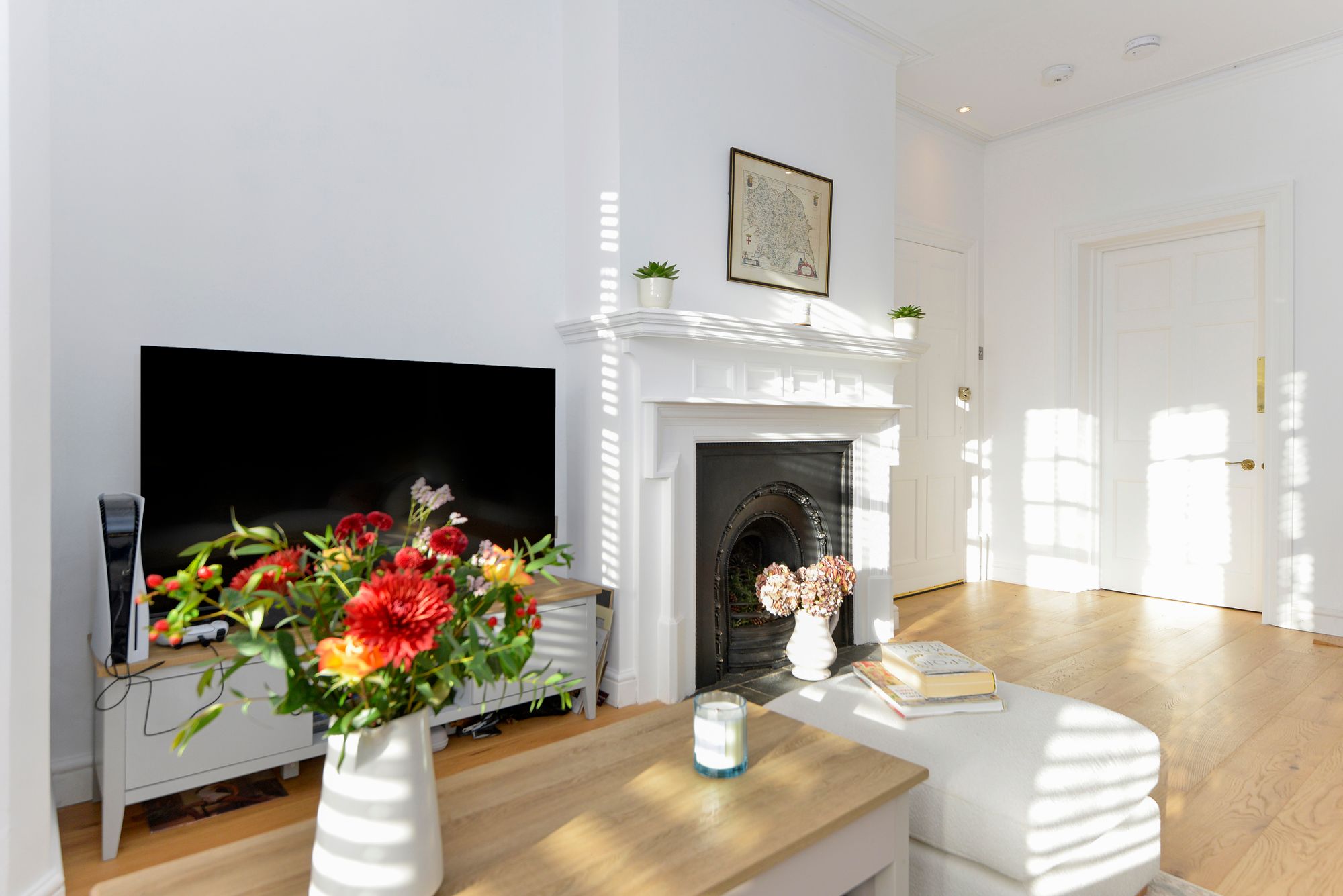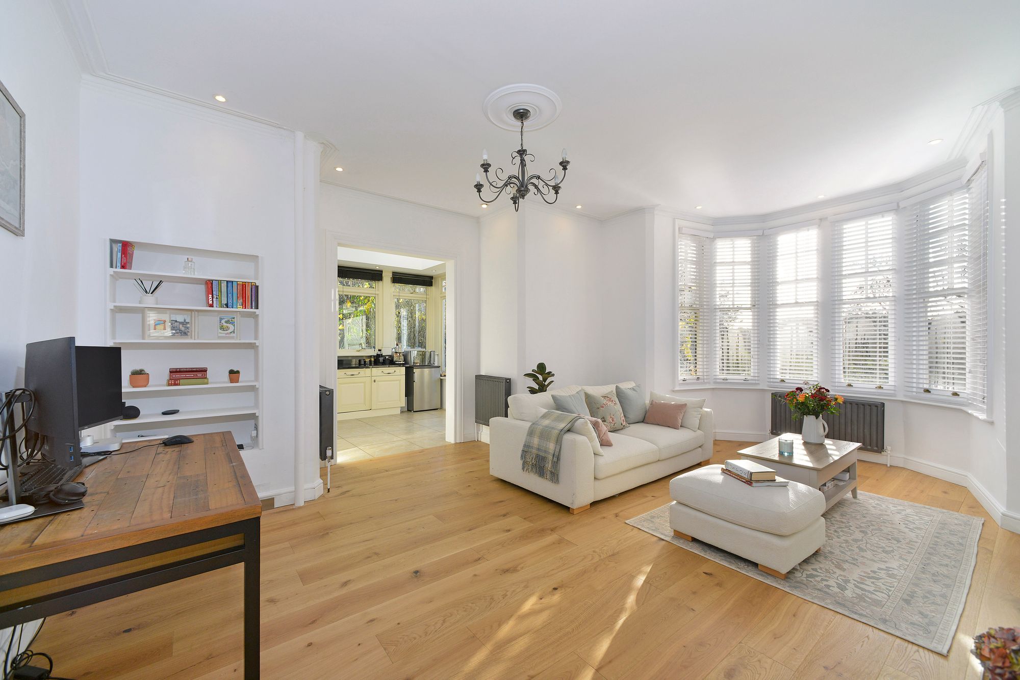 A large reception room benefits from an elegant bay window with fantastic views and an original fireplace. An abundance of natural light also flows into this room from the kitchen breakfast area.